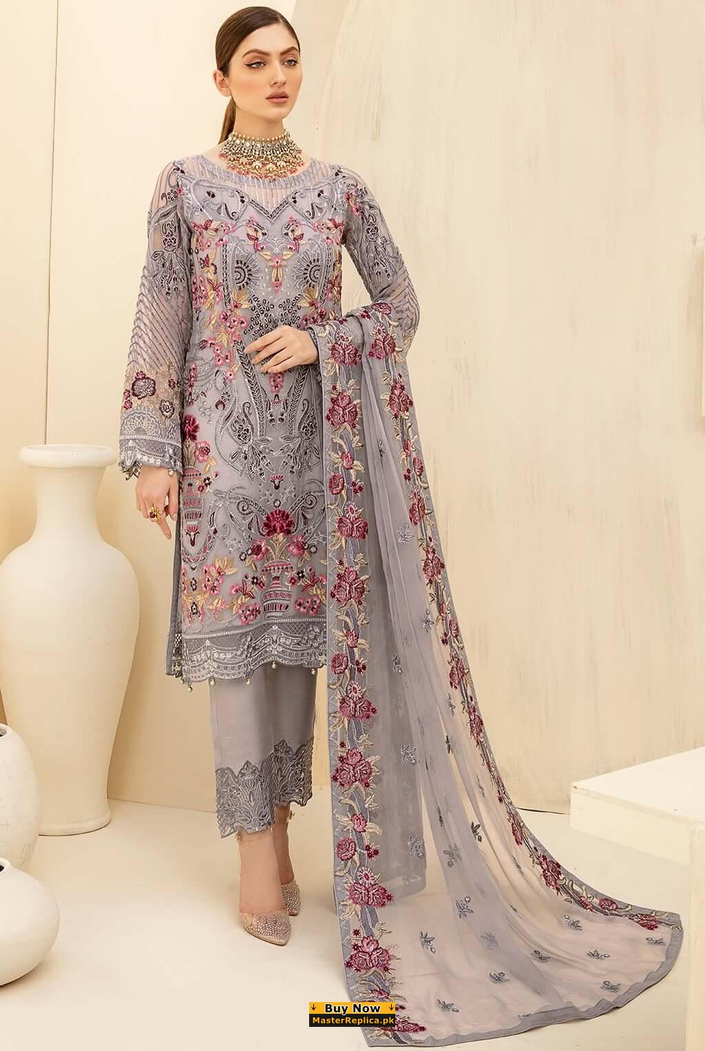 An example of beauty and elegance. Look breathtakingly stylish in this embroidered Master Replica from the Latest Collection of Ramsha.