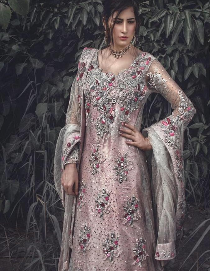 Embroidered Organza Dress Replica in beautiful peach color. Looks very stunning when worn at a day time party or event.