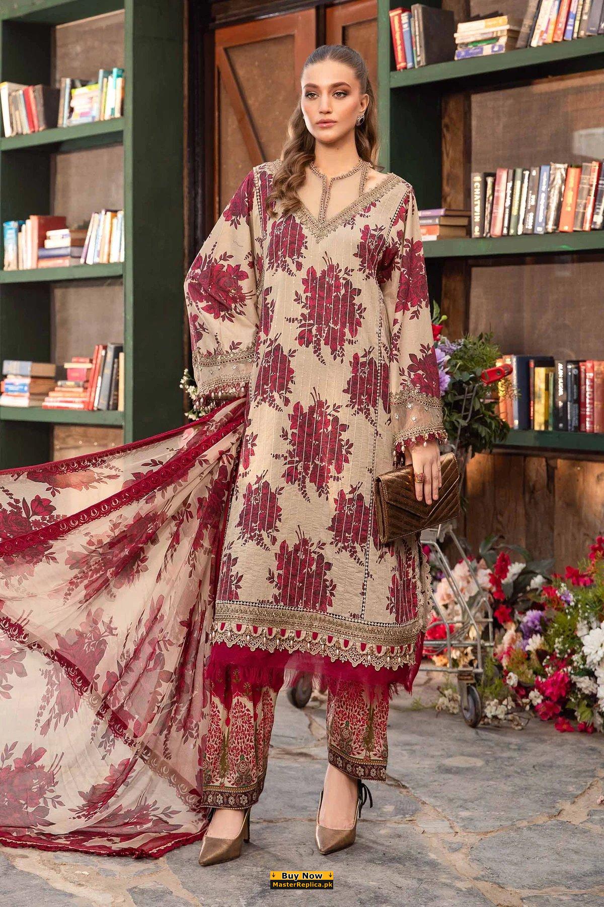 Introducing the Crimson Lawn Embroidered Replica – a stunning representation of tradition and chic from Maria b Latest Collection.
