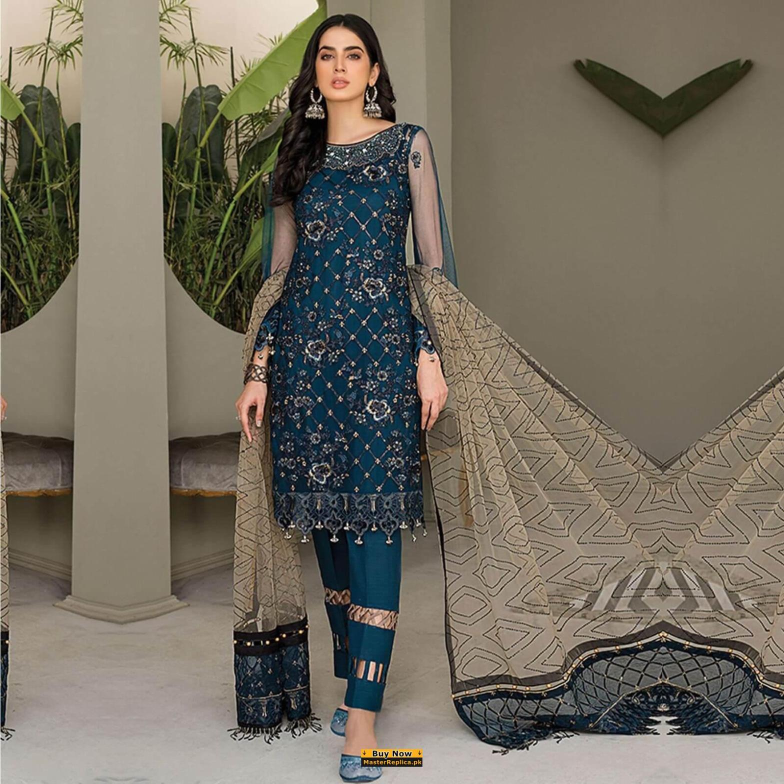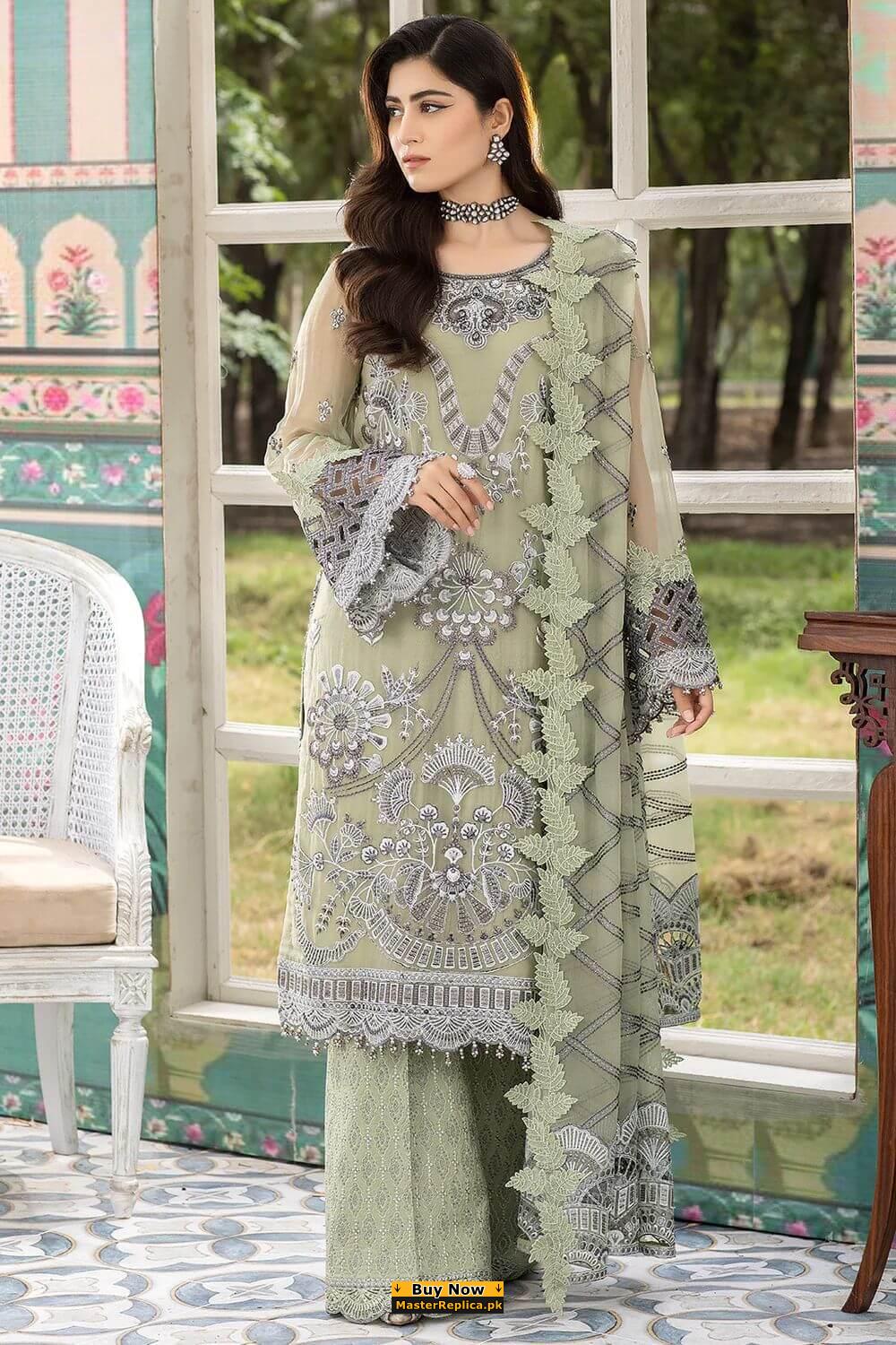 Dazzle in this alluring embroidered Master Replica from the Latest Designer Chiffon Collection depicting the Finest Craftsmanship.