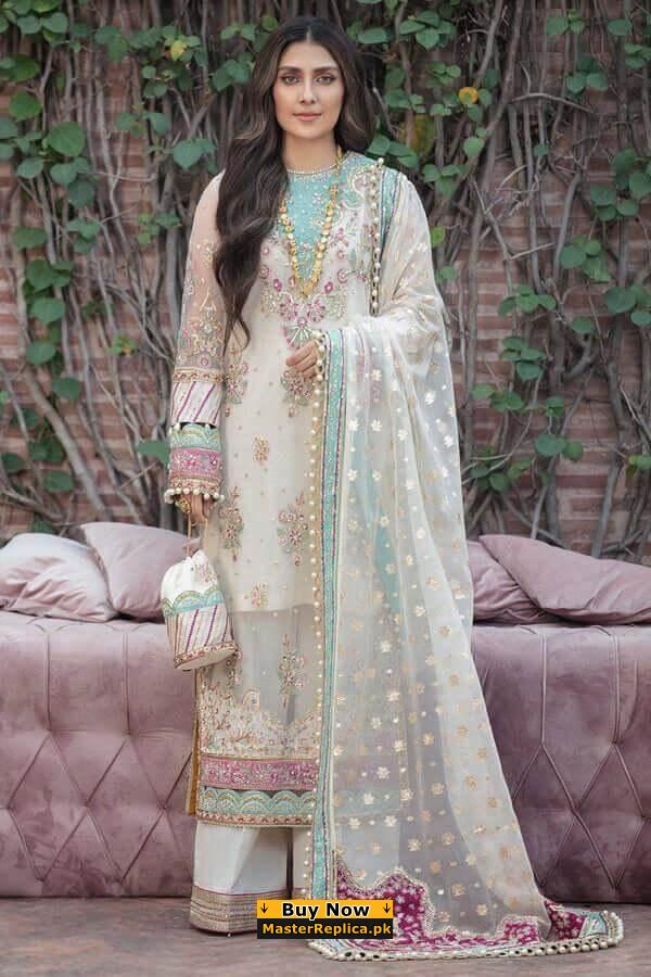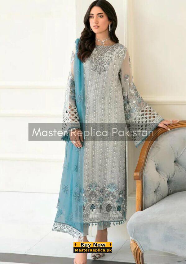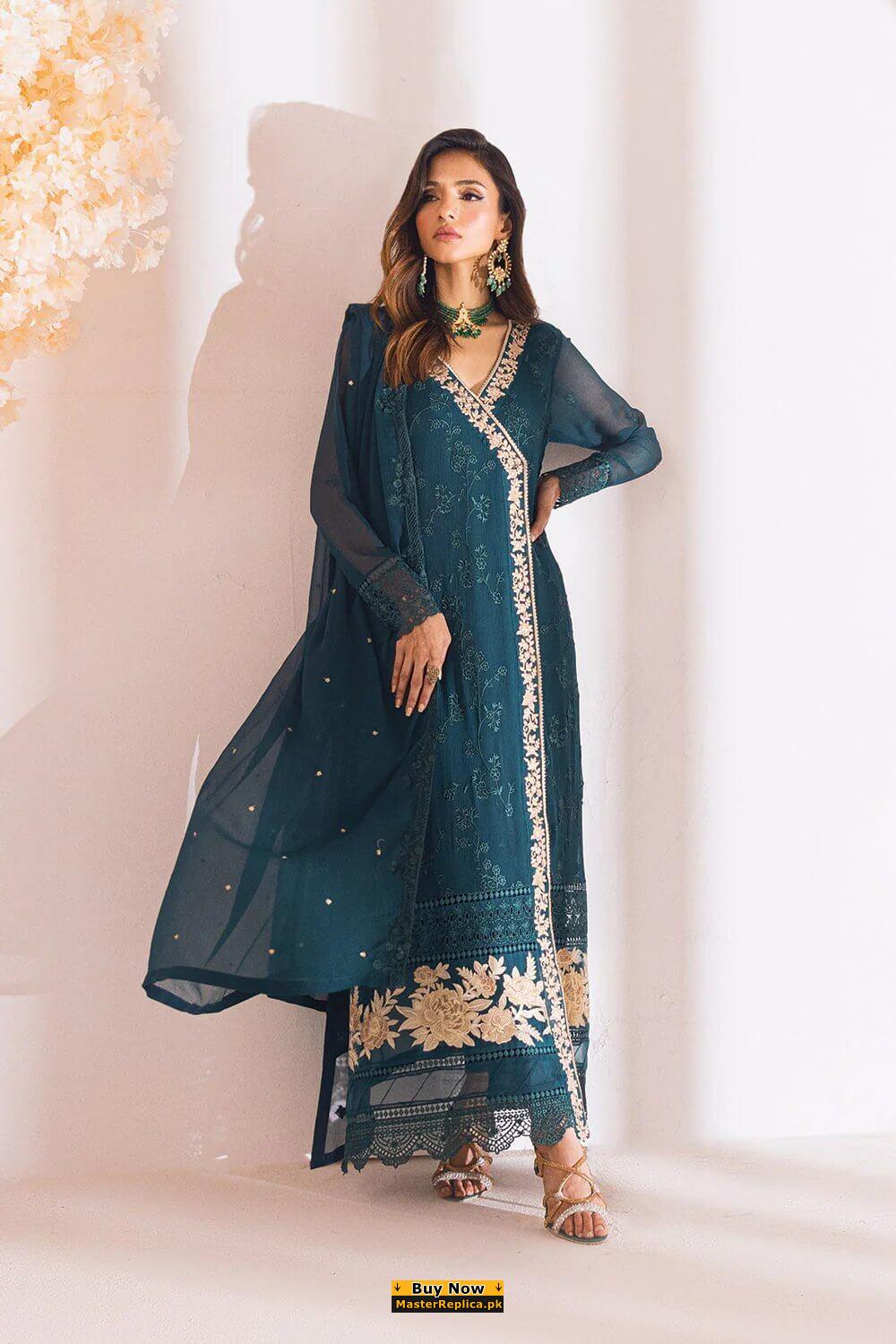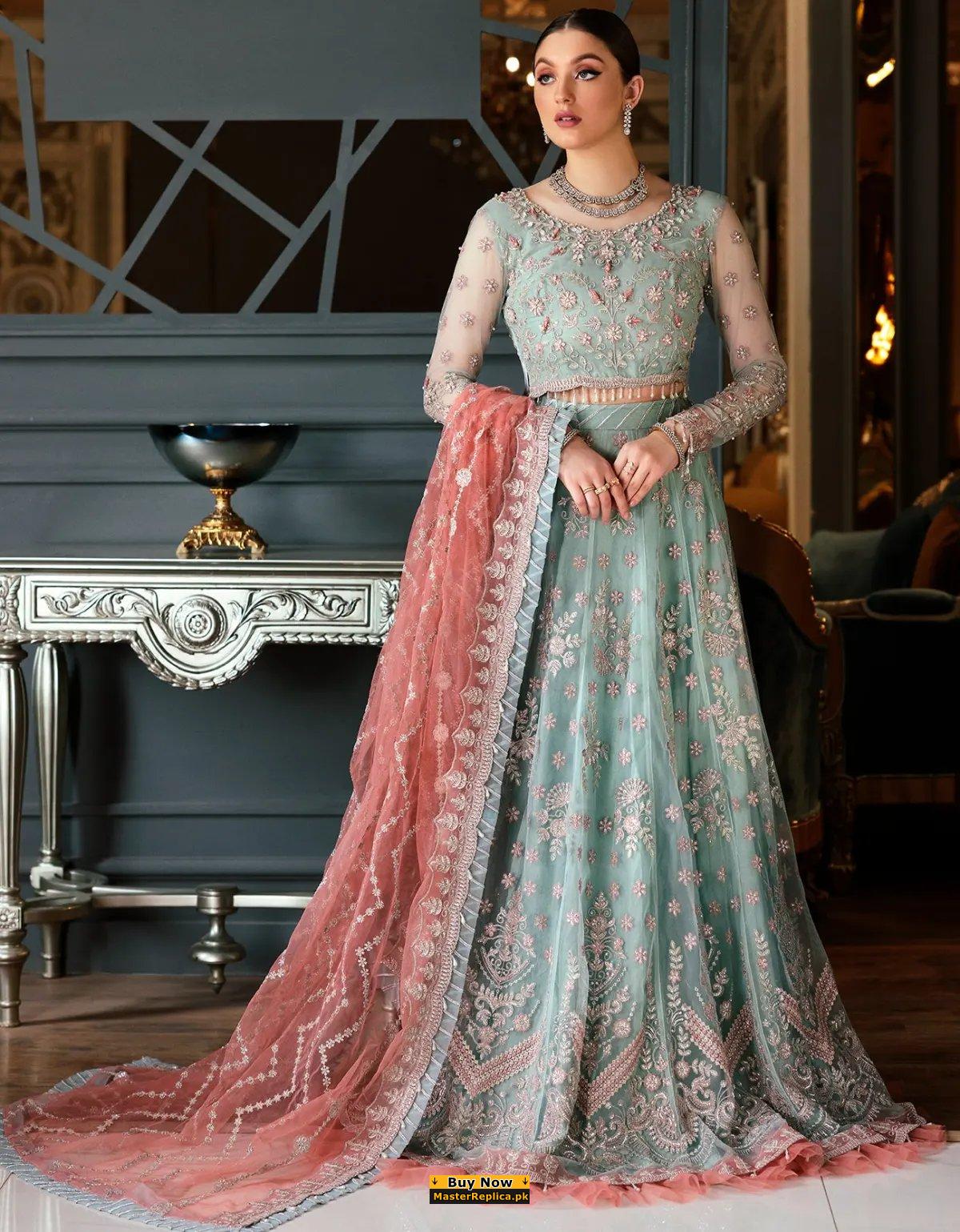 Portraying a fusion of baroque and vintage this Gorgeous Master Replica from the Latest Azure Chiffon Collection is perfect for any occasion.