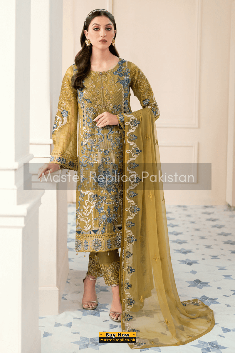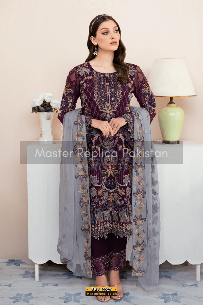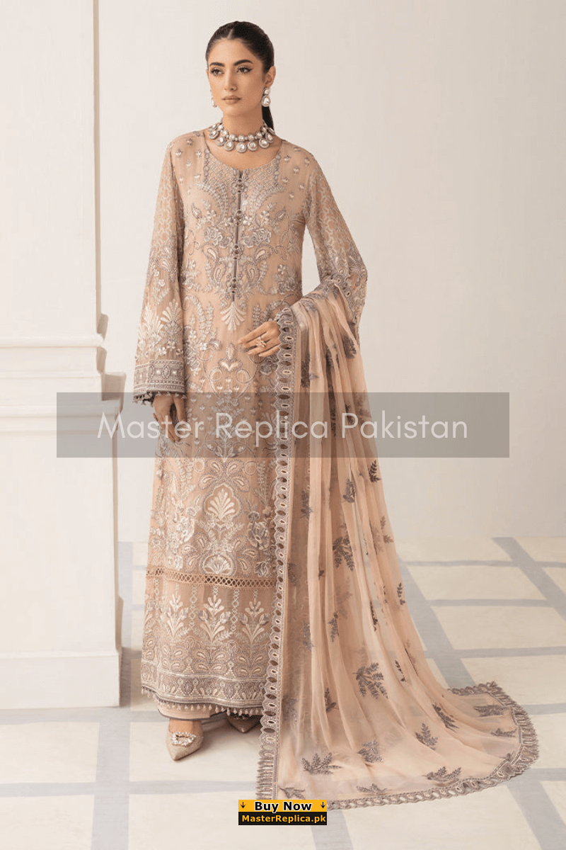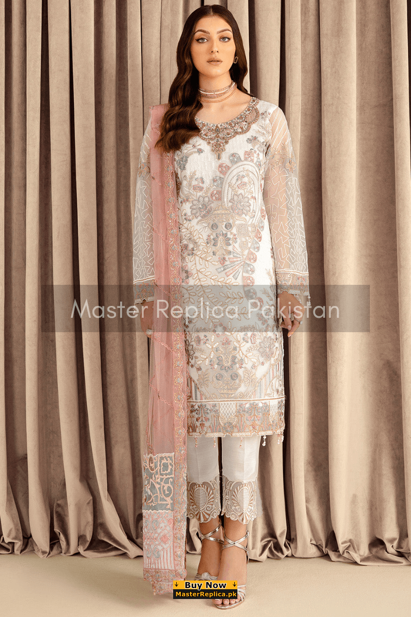 An example of beauty and elegance. Look breathtakingly stylish in this embroidered Master Replica from the Latest Collection of Ramsha.