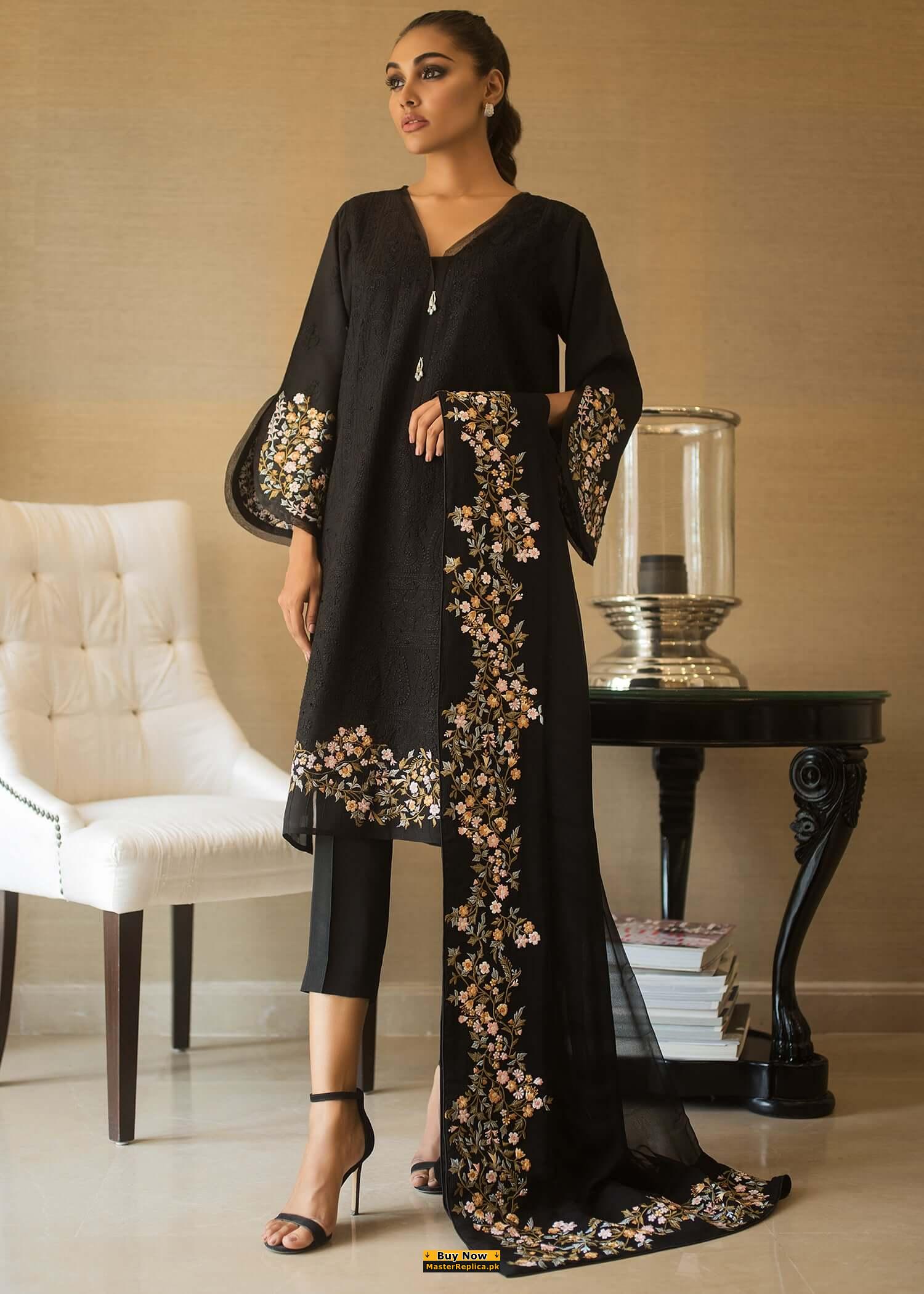 An example of beauty and elegance. Look breathtakingly stylish in this embroidered Master Replica from the Latest Designer Black Cotton Collection.