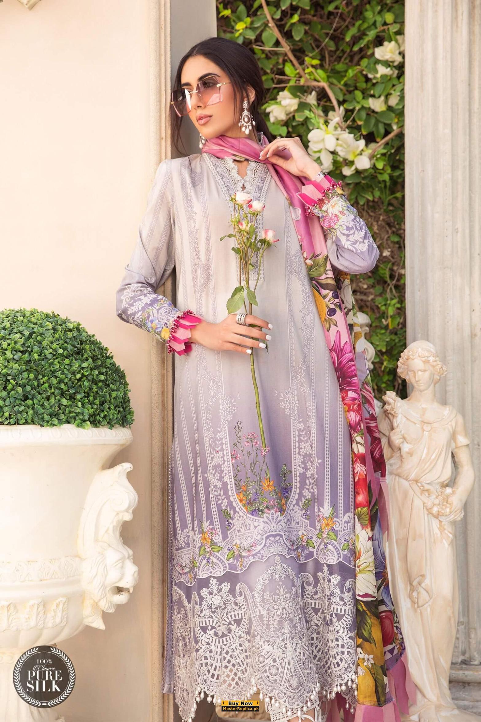 Dazzle in this alluring embroidered Master Replica from the Latest Maria B Summer Collection depicting the Finest Craftsmanship.