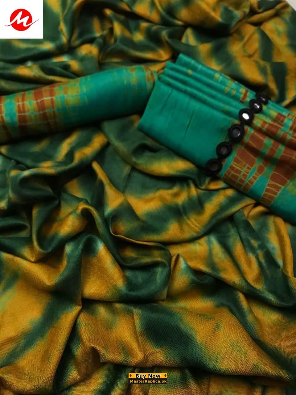 Tie and Dye Cotton Collection Fabric: Cotton (3 Pc Unstitched)Tie and Dye Cotton Silk Front, Back and SleevesTie and Dye Linen ShawlCotton Tie and Dye Silk Trousers