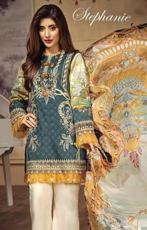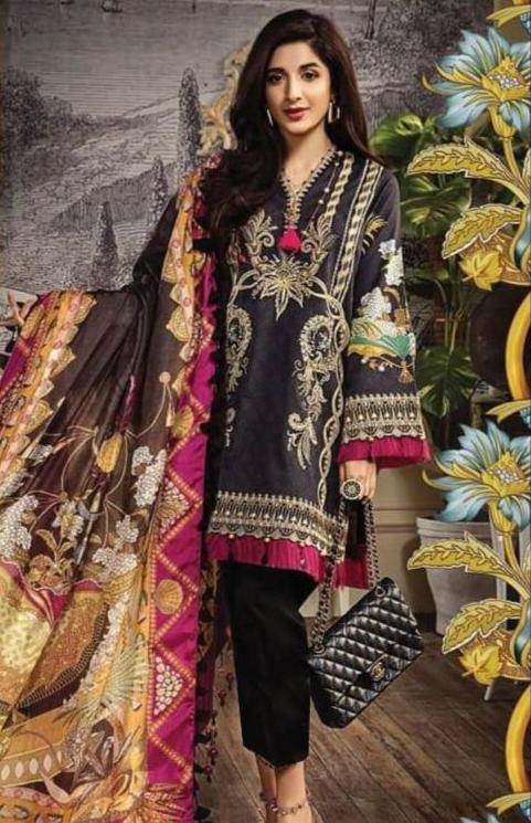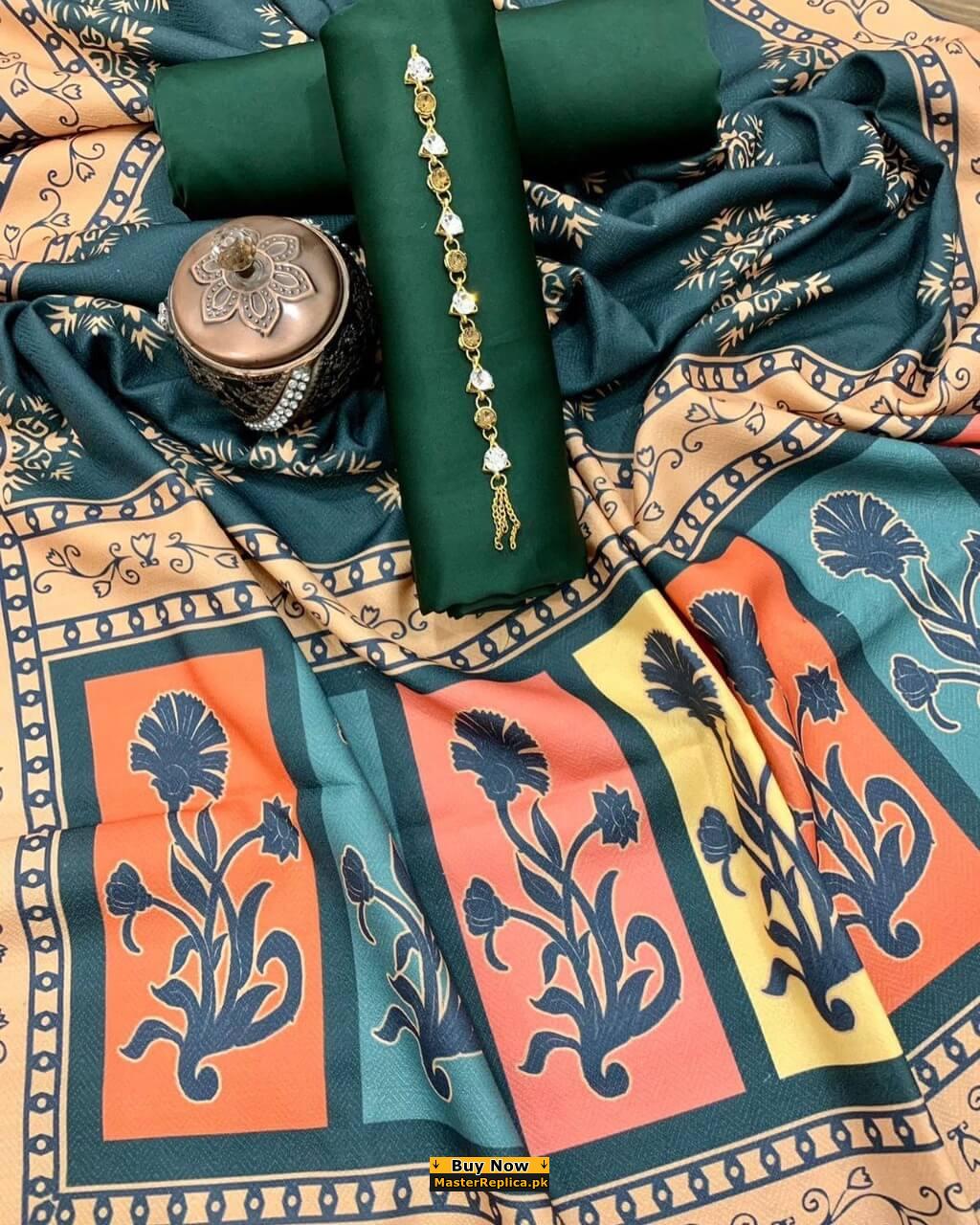 Latest Silk Unstitched 3 Piece Suit CollectionFabric: Silk (3 Pc Unstitched)Fancy NecklinePlain Silk Shirt Front, Back and SleevesDigital Printed Woolen ShawlPlain Silk Trousers Included