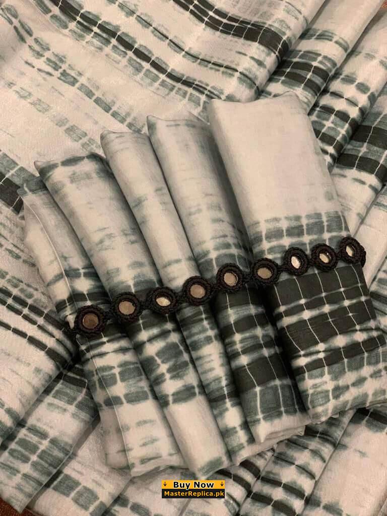 Tie and Dye Cotton 3 Piece Suit CollectionFabric: Cotton (2 Pc Unstitched)Mirror NecklineTie and Dye Cotton Silk Shirt Front, Back and SleevesTie and Dye Cotton Silk Dupatta