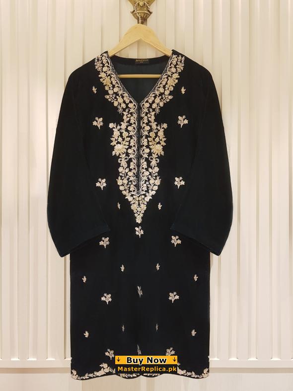 Dazzle in this alluring embroidered Master Replica from the Latest Agha Noor Velvet Collection depicting the Finest Craftsmanship.