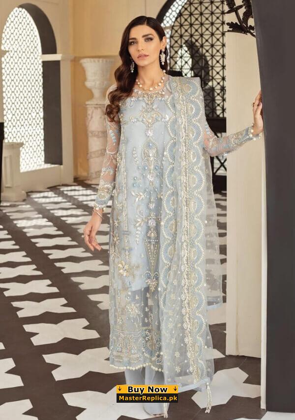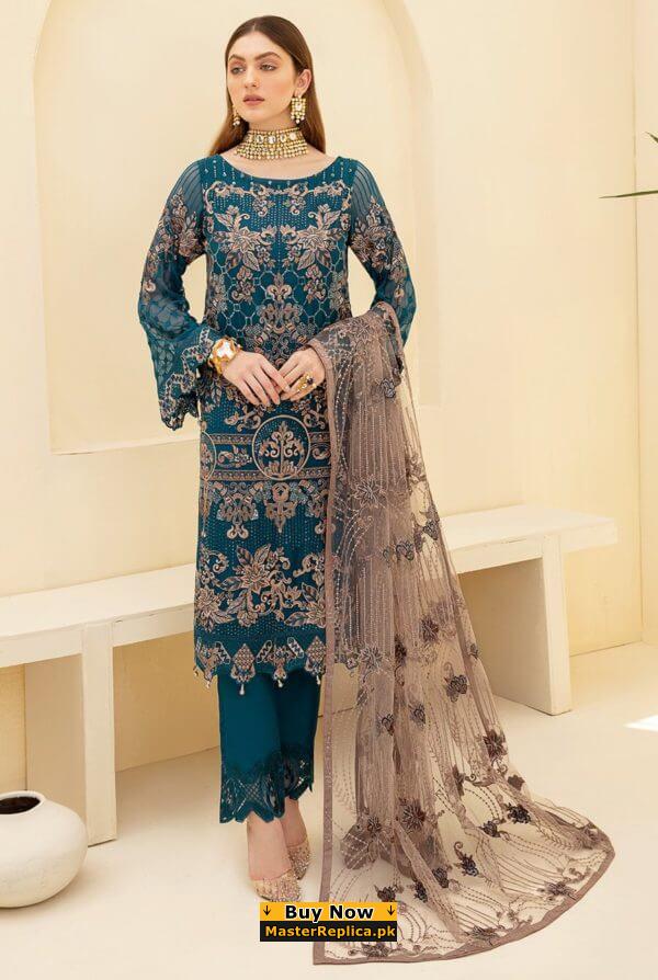A must have creation for day to evening wear. This Master Replica from the Latest Collection of Ramsha is perfectly designed with intricate embroidery.