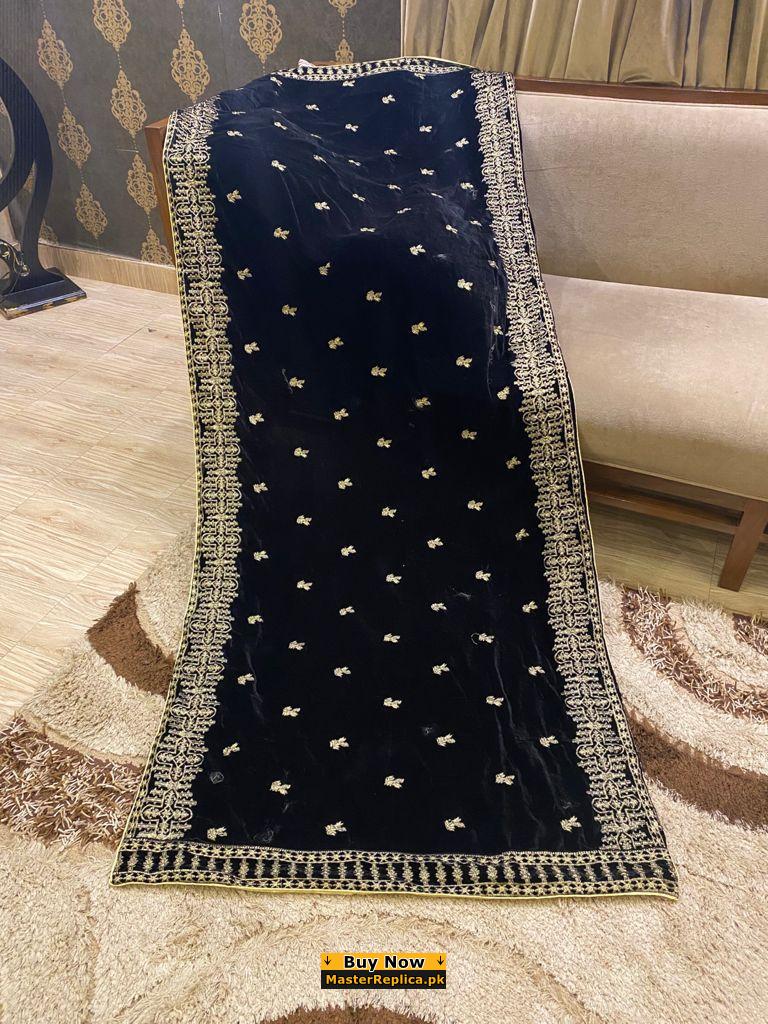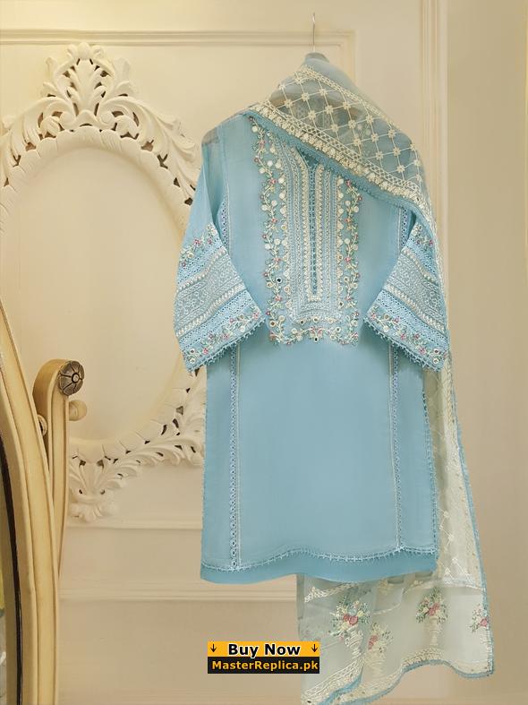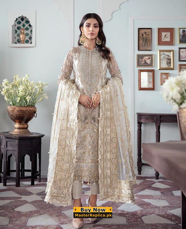 Exude a minimalist sobriety in this monotonous intricate embroidered Master Replica from the Latest Pakistani Party Wear Collection.