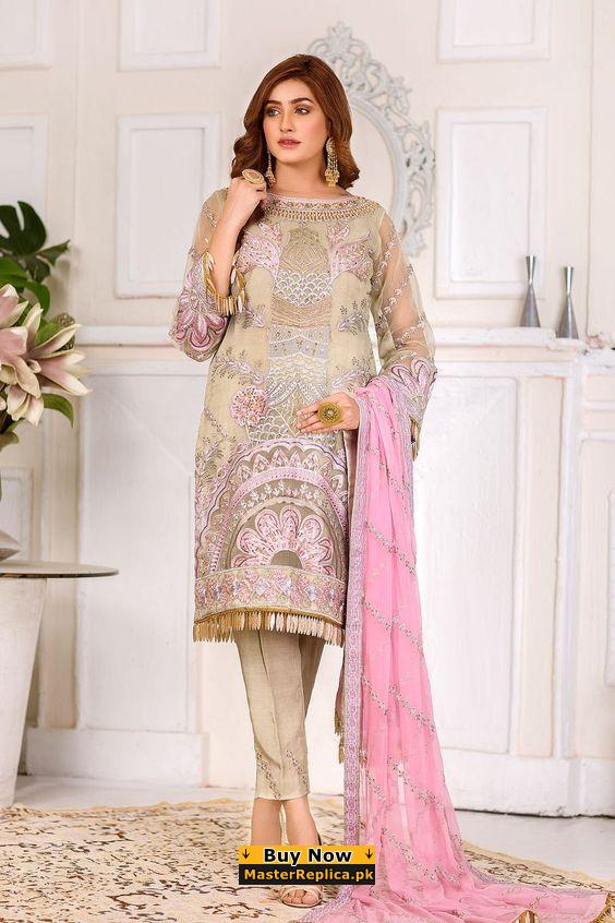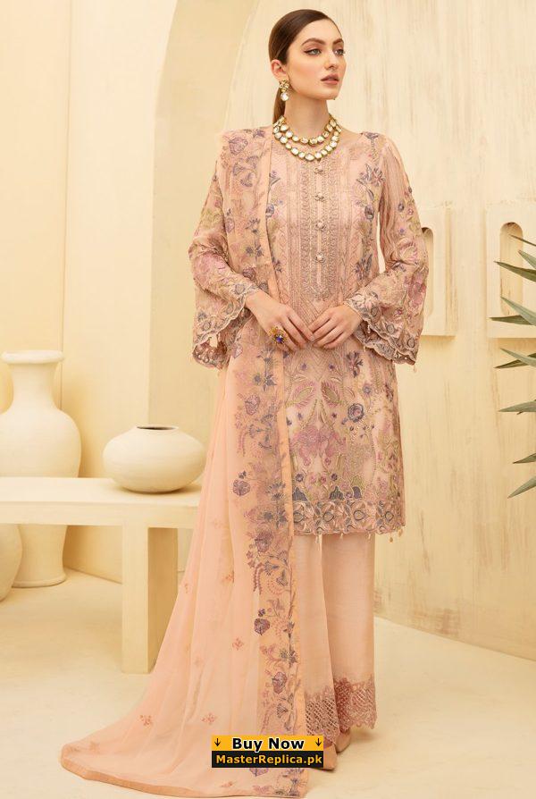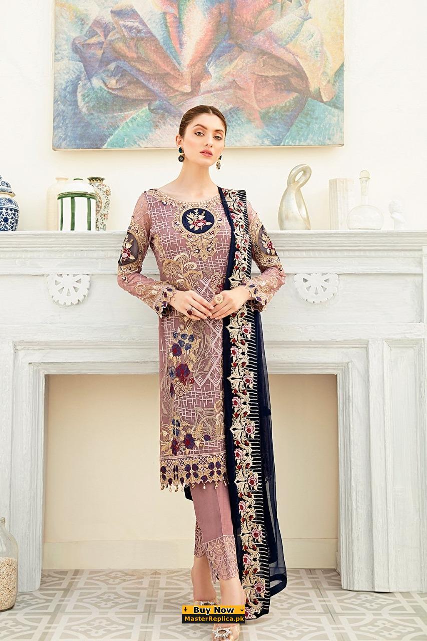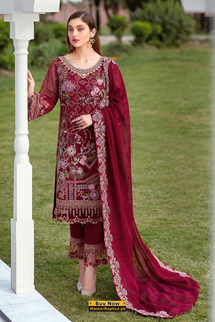Dazzle in this alluring embroidered Master Replica from the Latest Ramsha Chiffon Collection depicting the Finest Craftsmanship.
