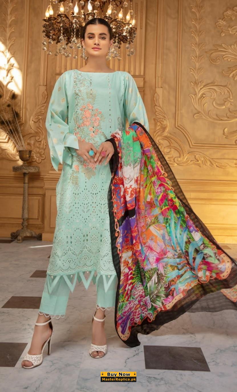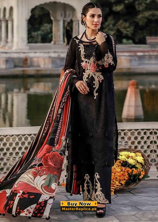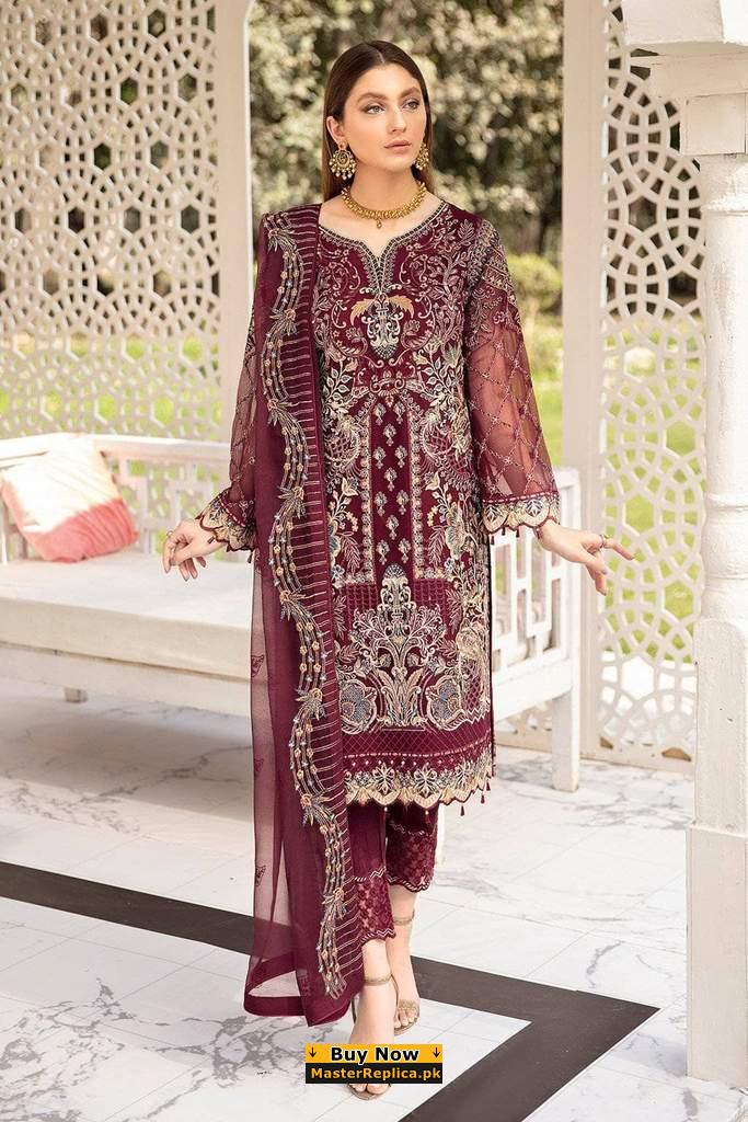 Bring out your beauty with this traditional yet modern embroidered Master Replica from the Latest Ramsha Chiffon Collection.