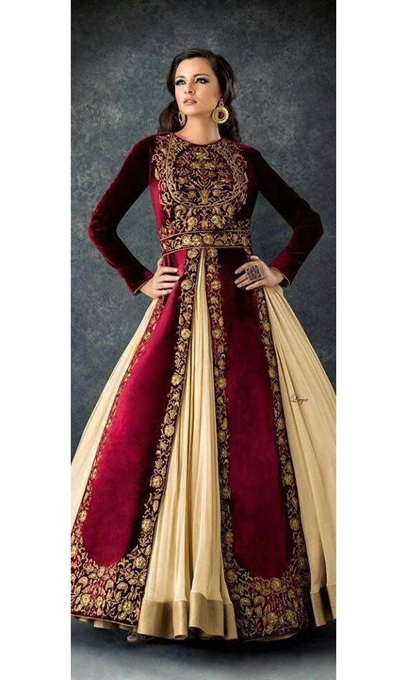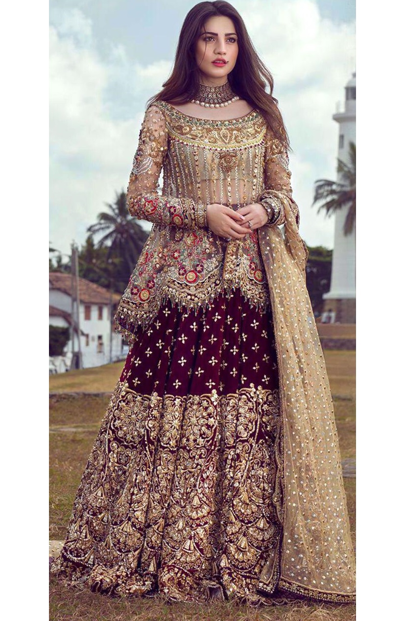 Pakistani Designer Replica frock with maroon velvet embellished bodice and golden skirt. A gorgeous master replica of Pakistani designer wear for the wedding season.