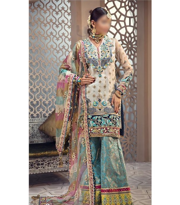 Anaya Organza Replica suit from latest anaya replica suits collection. This suit comes with embroidered bunches (motifs) for front daaman and dupatta.