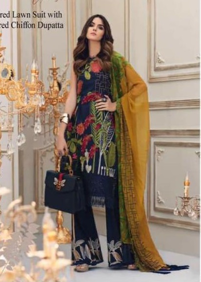 Fancy Charizma Chiffon Replica 2019 in a beautiful contrast of black with mustard. This charizma suit replica has a floral embroidery on the fabric along with other motifs.