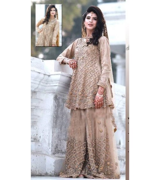 Bridal Suit Replica in golden color with full embroidery on front and bottom. This replica bridal suit also has a net embellished dupatta.