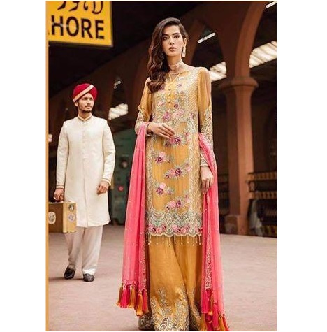 Maria B Silk Replica in beautiful mustard, orange and maroon color. Heavy embellished Maria b party wear replica for a wedding or party.