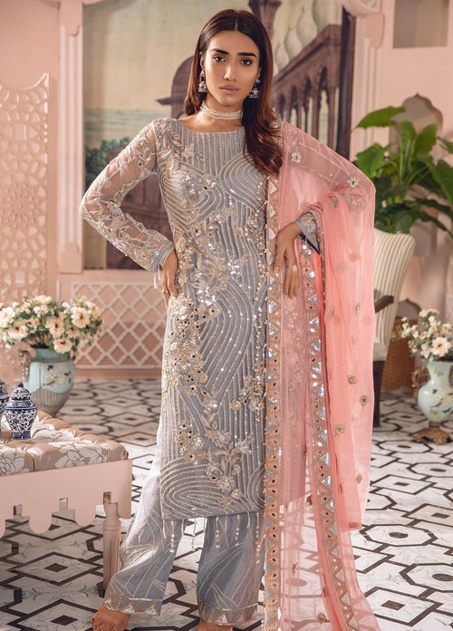 Fully Embroidered Net Front and Back enhanced with Embroidered Daman